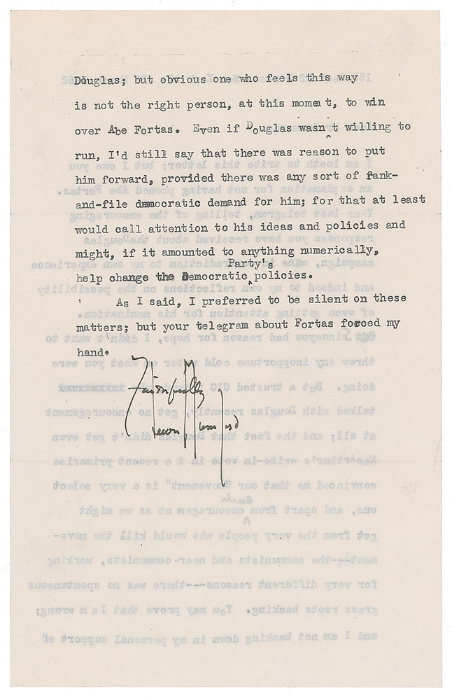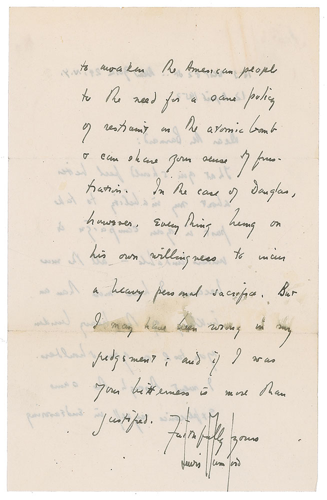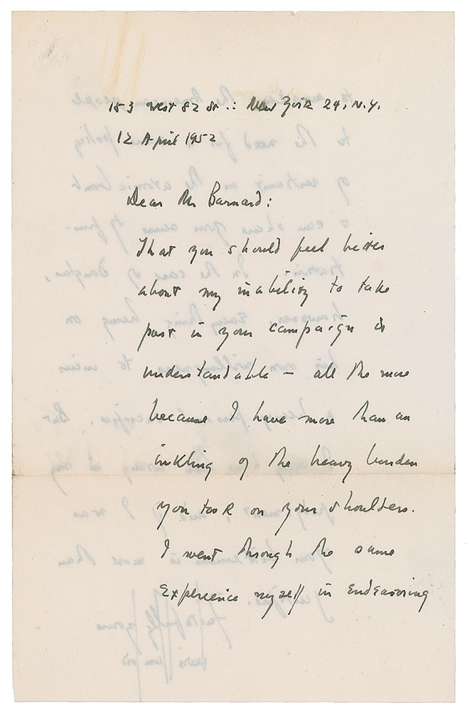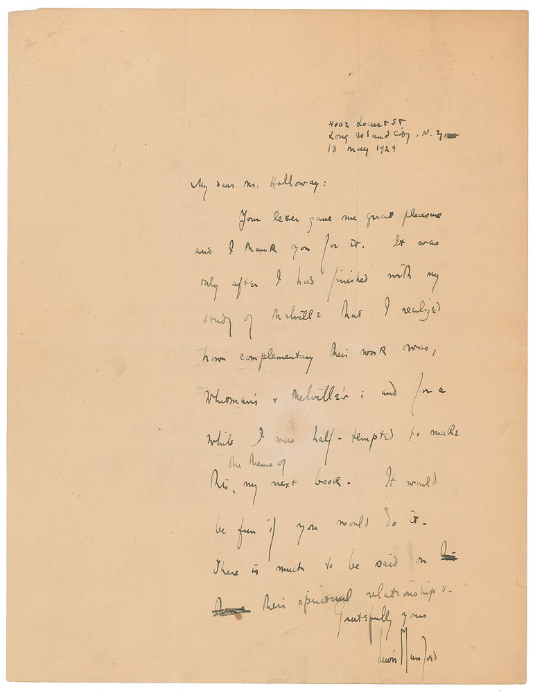 American writer, critic, and historian (1895-1990). Three letters by Mumford, including two ALSs and one TLS: the first ALS is one page, May 18, 1929, to "Mr. Holloway," in part: "It was only after I had finished with my study of Melville that I realized how complementary their work was, Whitman's & Melville's; and for a while In was half-tempted to make this the theme of my next book"; the second ALS is one page both sides, April 12, 1952, to "Mr. Barnard," in part: "I have more than an inkling of the heavy burden you took on your shoulders. I went through the same experience myself in endorsing to awaken the American people to the need for a sane policy of restraint on the atomic bomb & can share your sense of frustration"; and the TLS is one page both sides, March 26, 1952, to "Mr. Barnard," about the campaign to elect Justice William O. Douglas as president, in part: "The fact that Douglas didn't get even MacArthur's write-in vote in the recent primaries convinced me that our 'movement' is a very select one, and apart from such encouragement as we might get from the very people who would kill the movement—the communists and near-communists, working for very different reasons—there was no spontaneous grass roots backing." In overall very good to fine condition.