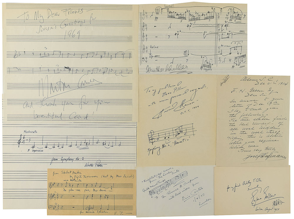 Group of eight items signed by composers, predominately consisting of musical quotations ranging from just a couple notes to complete passages, including: Virgil Thomson (AMQS), Gunther Schuller (AMQS), Eric Coates (AMQS), Eugene Aynsley Goossens (AMQS), Morton Gould (AMQS), Walter Piston (AMQS), Howard Hanson (AMQS), and Josef Hofmann (ALS). In overall fine condition.