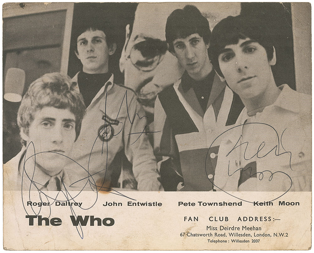 Desirable vintage 8.25 x 6.5 cardstock publicity photo distributed by The Who's fan club, signed in black ballpoint by Keith Moon, John Entwistle, and Roger Daltrey. In very good condition, with scattered creases and some light staining and soiling. Accompanied by a letter of provenance from the original recipient, who acquired the signatures in person while working as a bouncer at Northwich Memorial Hall, the venue for their concert on February 19, 1966. An excellent early promo image of The Who still quite capable of becoming a fully signed rarity.