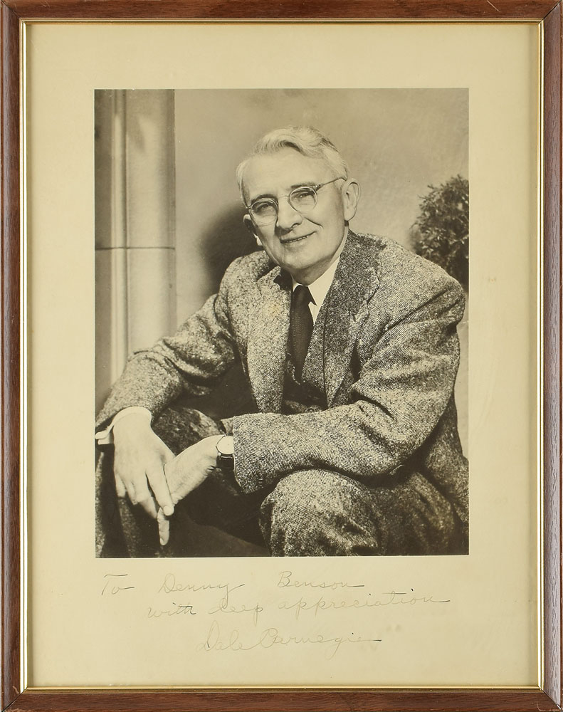 American writer and lecturer (1888-1955) who is best known for his books How to Win Friends and Influence People and How to Stop Worrying and Start Living. Vintage matte-finish 10 x 13 photo, signed and inscribed in black ink, "To Denny Benson, with deep appreciation, Dale Carnegie.” Framed to a slightly larger size. In fine condition.