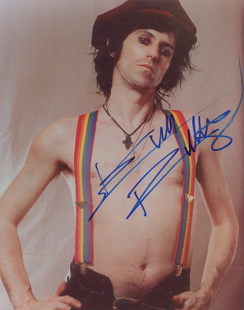 Color glossy 11 x 14 photo of a shirtless Keith Richards wearing rainbow suspenders, signed in blue felt tip. In fine condition. From The John Brennan In-person Autograph Collection.
