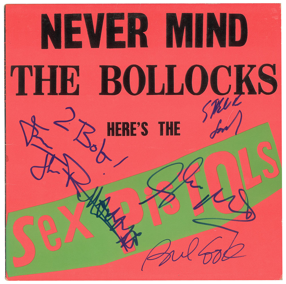 Never Mind the Bollocks, Here's The Sex Pistols album signed and inscribed on the front cover in blue felt tip, "2 Bob! from Johnny Rotten," "Steve Jones," "Paul Cook," and "Glen Matlock." In fine to very fine condition. The record is included. From The John Brennan In-person Autograph Collection.