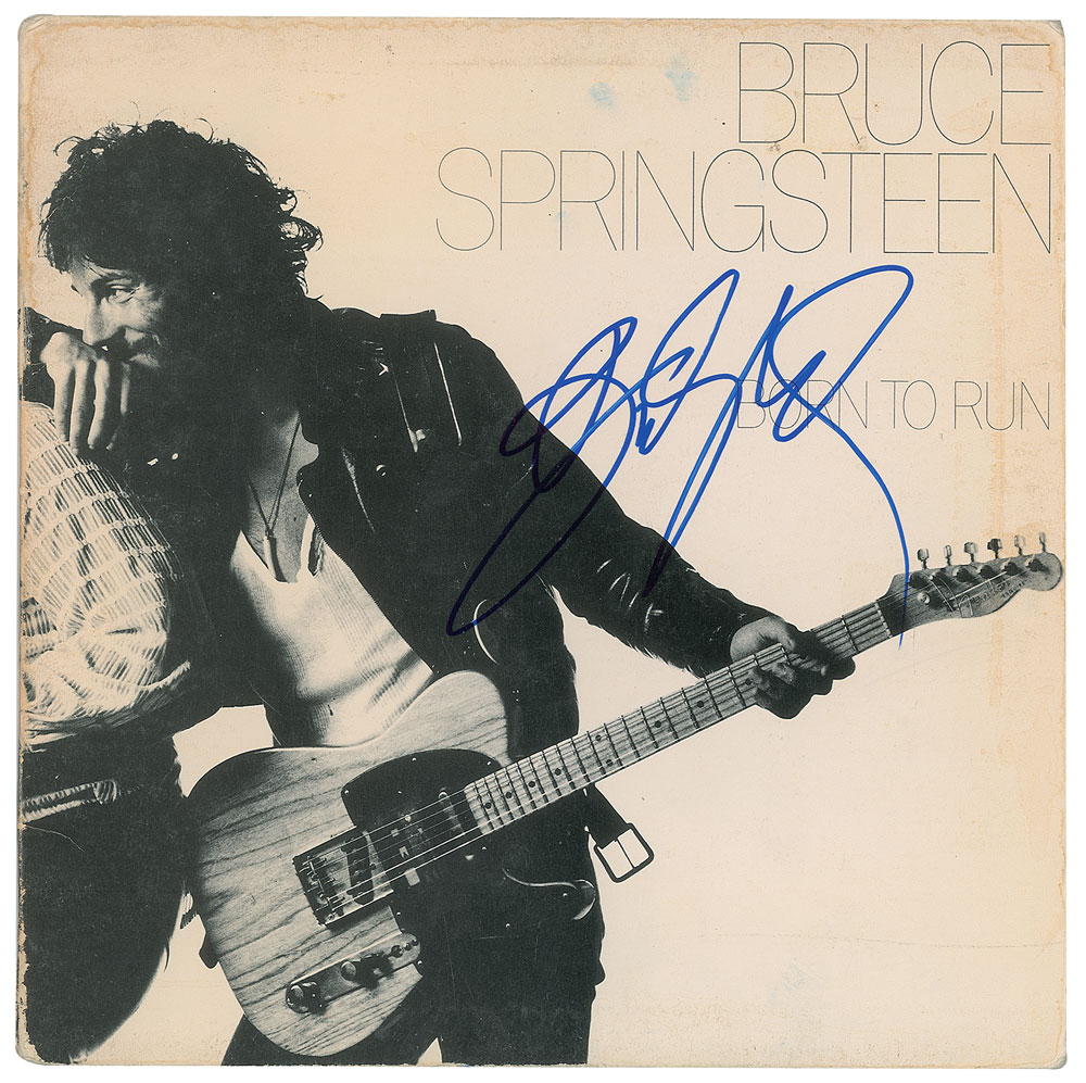 Born to Run album by Bruce Springsteen, signed on the front cover in blue felt tip. In very good to fine condition, with light dampstaining along the edges, and light blue ink stains near the top edge. The record is included. From The John Brennan In-person Autograph Collection.