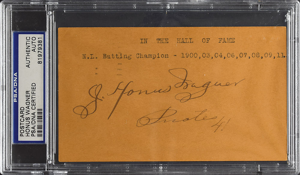 Vintage fountain pen signature, "J. Honus Wagner, Pirates, 41" on an off-white 5.5 x 3.25 government postcard. Reverse postmarked at Philadelphia on June 8, 1941. In fine condition, with overall toning. Encapsulated in a PSA/DNA authentication holder.