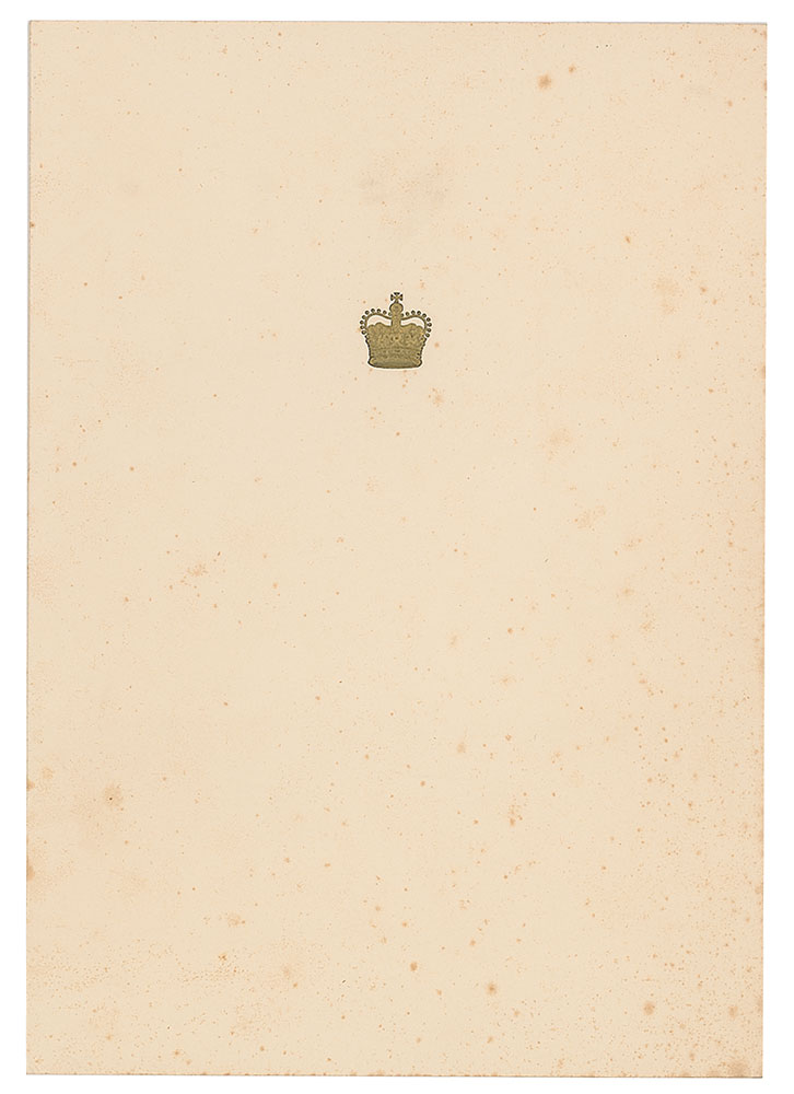 Royal Christmas and New Year card from 1956 with an embossed seal on the front, measuring 13.75 x 9.75 open, with the inside featuring a photo of the royal family on a ship, signed below in fountain pen, "Elizabeth R, 1956" and "Philip." In very good to fine condition, with light overall foxing. Accompanied by the original transmittal envelope.