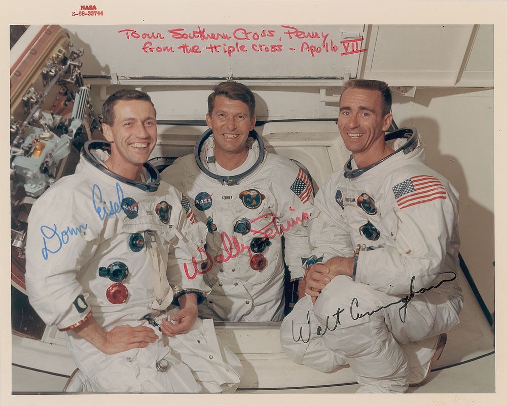 Official color glossy 10 x 8 red-numbered NASA photo of the Apollo 7 prime crew in their white space suits, posing with the capsule, signed and inscribed in red felt tip, "To our Southern Cross, Penny, from the triple cross—Apollo VII, Wally Schirra," in blue felt tip, "Donn Eisele," and in black felt tip, "Walt Cunningham.” Reverse bears “A Kodak Paper” watermarks. In very good to fine condition, with two perpendicular creases to Eisele's left leg.