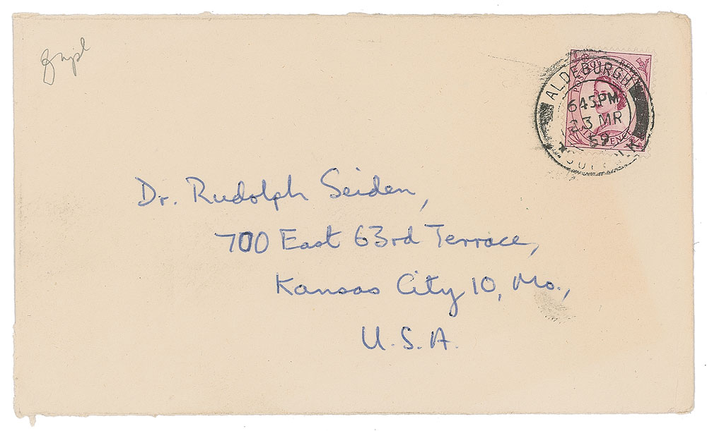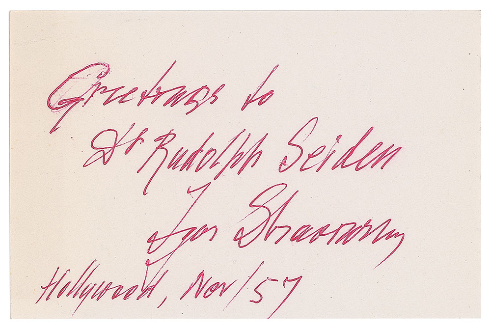 Red ballpoint signature and inscription, "Greetings to Dr. Rudolph Seiden, Igor Stravinsky, Hollywood, Nov/57,” on an off-white 3.5 x 2.25 card. In fine condition, with a slight bend to the upper left corner. Accompanied by the original mailing envelope.
