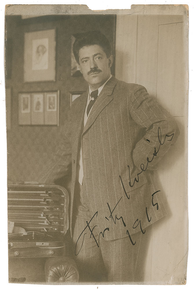 Austrian-born composer and violin virtuoso (1875-1962). Vintage matte-finish 4.25 x 6.5 photo of Kreisler with an open violin case to his side, signed in fountain pen, "Fritz Kreisler, 1915." In very good to fine condition, with trimmed edges, and edge loss to the top which could be matted out.