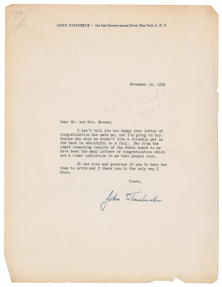 TLS, one page, 8.5 x 11, personal letterhead, November 12, 1962. Letter to Mr. and Mrs. Ken Browne, sending thanks for congratulations on his receipt of the 1962 Nobel Prize in Literature. In part: "I can't tell you how happy your letter of congratulation has made me, but I'm going to try. Anyone who says he doesn't like a friendly pat on the back is untruthful or a fool. Far from the least rewarding results of the Nobel Award to me have been the many letters of congratulation which are a clear indication to me that people care." In very good to fine condition, with creasing and chipping to the edges.