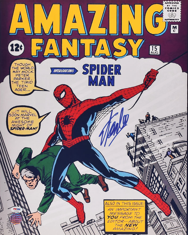 Color satin-finish 16 x 20 photo of the cover to issue No. 15 of the Amazing Fantasy comic book, which marked the debut appearance of Spider-Man, signed in blue felt tip by Stan Lee. In fine condition, with a PSA/DNA label affixed to lower left corner. Accompanied by a certificate of authenticity from PSA/DNA.