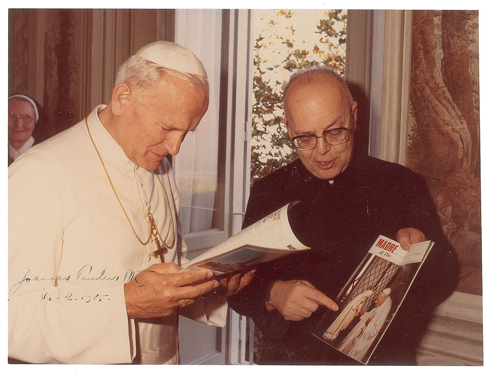 Color glossy 9.25 x 7 photo of Pope John Paul II with famous exorcist Father Gabriele Amorth, taken by Vatican photographer Arturo Mari, signed in black felt tip, "Joannes Paulus II, 16. 12. 1985." In fine condition, with the signature a couple of shades light. The consignor notes that this originates from the collection of Amorth's brother, Prof. Luigi Amorth of Modena.