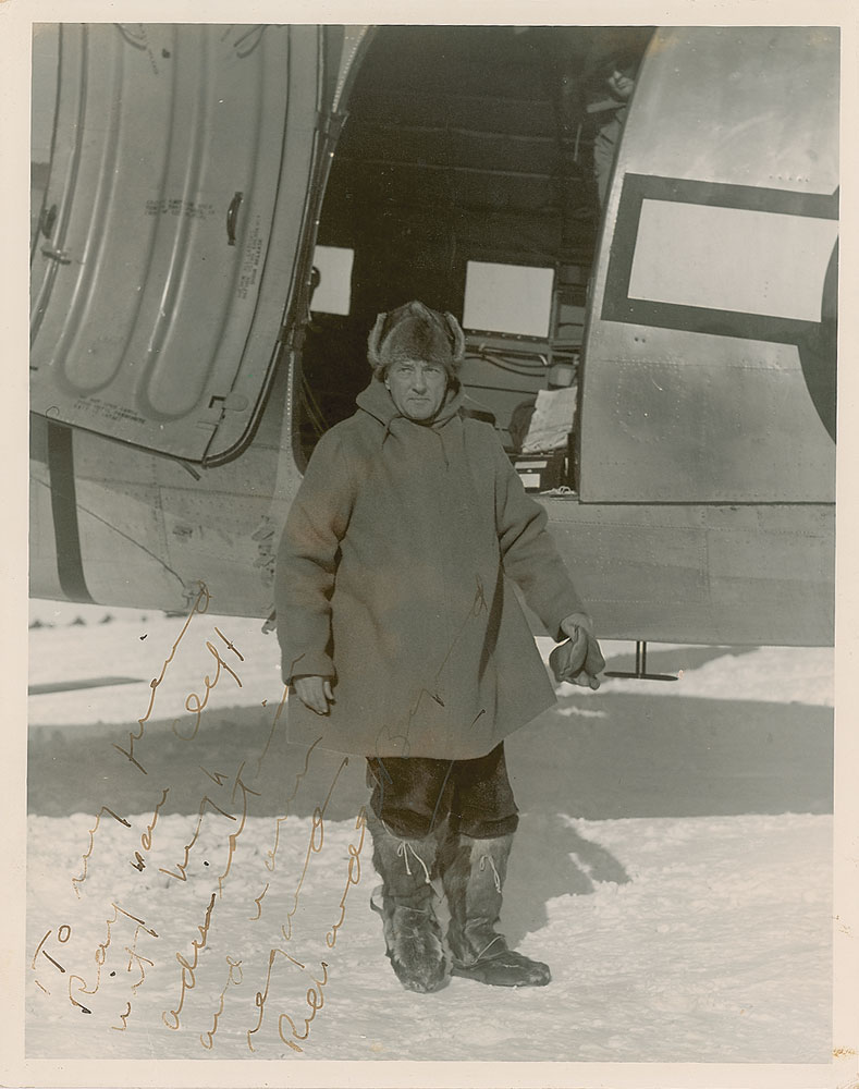 Vintage matte-finish 8 x 10 full-length photo of Rear Admiral Byrd exiting a plan on February 16, 1947, near the end of the Operation Highjump operation, signed and inscribed in fountain pen, "To my friend Ray van Cleft, with high admiration and warm regard, Richard E. Byrd.” Reverse bears an Official US Navy stamp. In fine condition. Items signed in full by Byrd remain scarce and highly sought after.