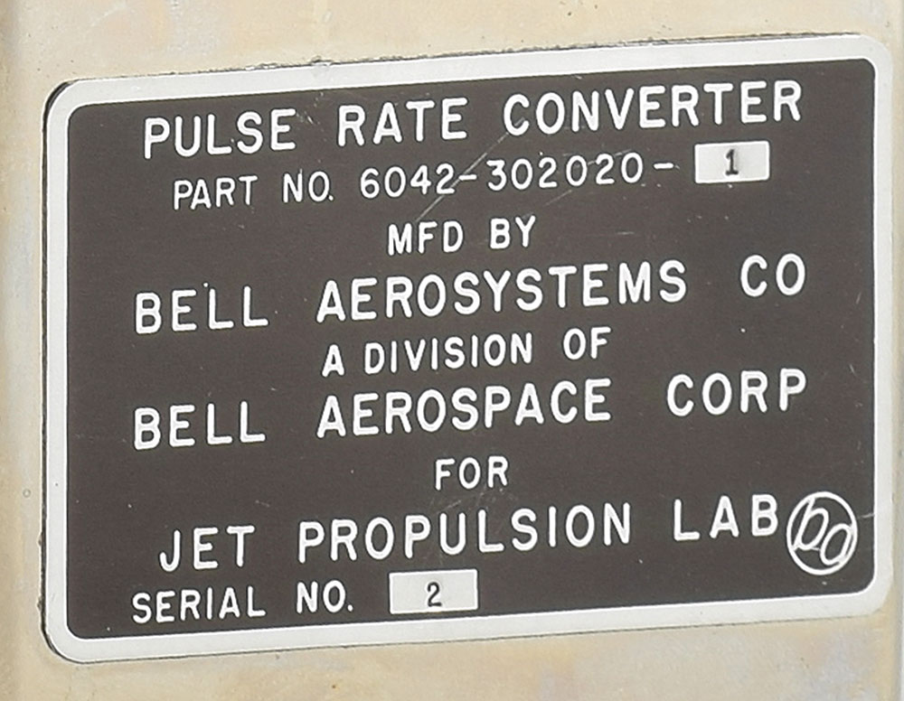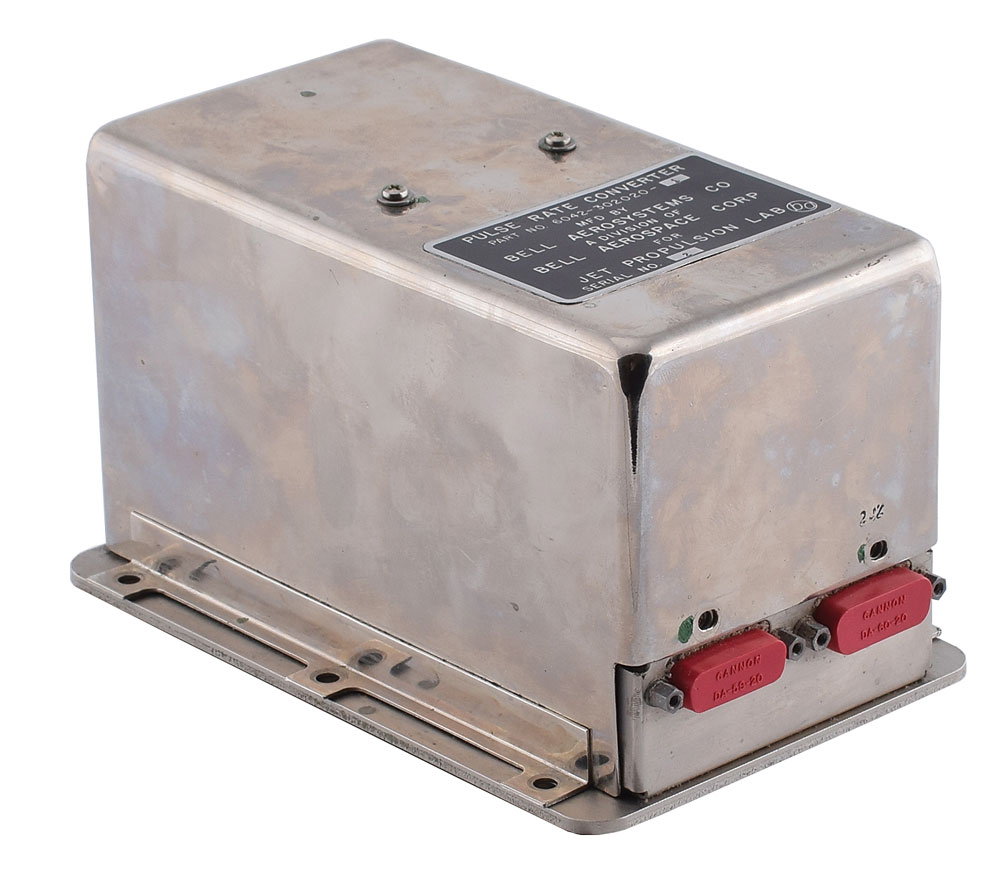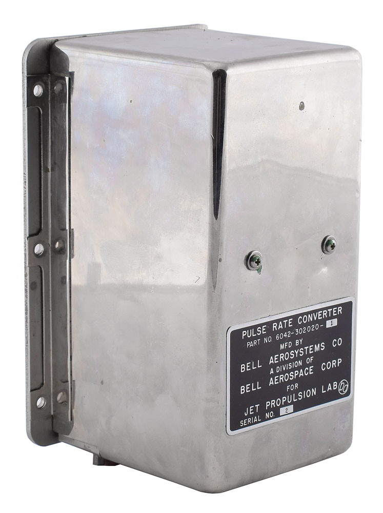 Pule Rate Converter made by Bell Aerosystems for the Jet Propulsion Laboratory, measuring 4.25″ x 7″ x 4″, with a black parts tap on the top of the mirrored metal housing: "Pulse Rate Converter, Part No. 6042-302020-1, Mfd by Bell Aerosystems Co, A Division of Bell Aerospace Corp for Jet Propulsion Lab, Serial No. 2." In fine condition.