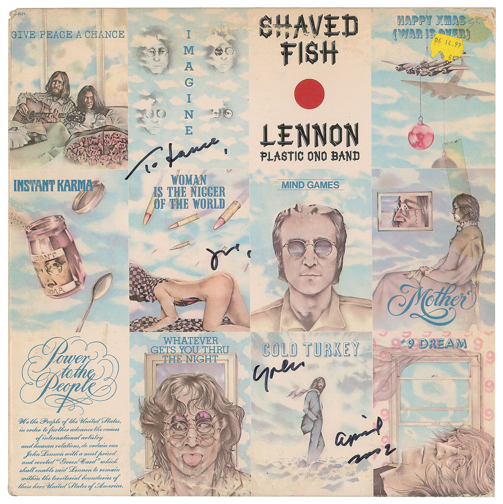 Shaved Fish album by John Lennon and the Plastic Ono Band, signed and inscribed on the front cover in black felt tip, "To Lance, love, Yoko, April 2002." In very good to fine condition, with light scuffing, an affixed price sticker and some old price sticker residue to the upper right corner, and an old piece of tape to the right side. The record is not included. Accompanied by a certificate of authenticity from JSA. From The John Brennan In-person Autograph Collection.
