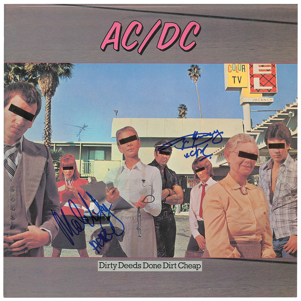 Dirty Deeds Done Dirt Cheap album by AC/DC, signed on the front cover in blue felt tip by Angus and Malcolm Young, with both adding "AC/DC." In fine condition. The record is included.
