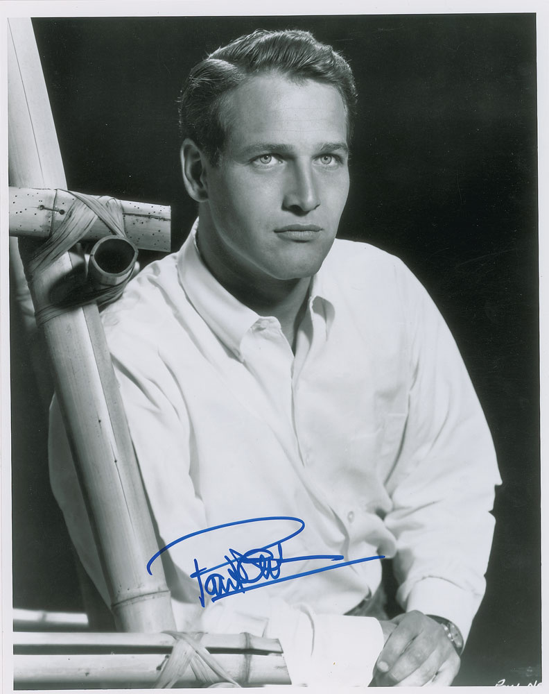 Satin-finish 11 x 14 half-length photo of a young Paul Newman next to a bamboo frame, signed in blue felt tip. In very fine condition. From The John Brennan In-person Autograph Collection.