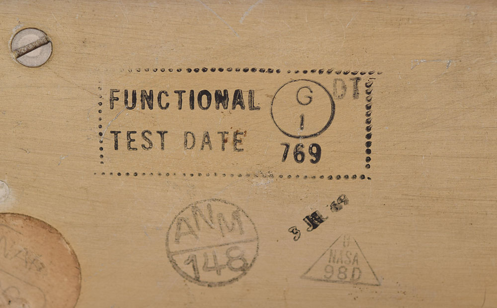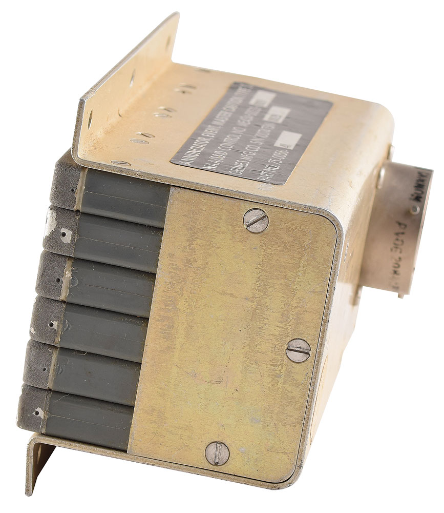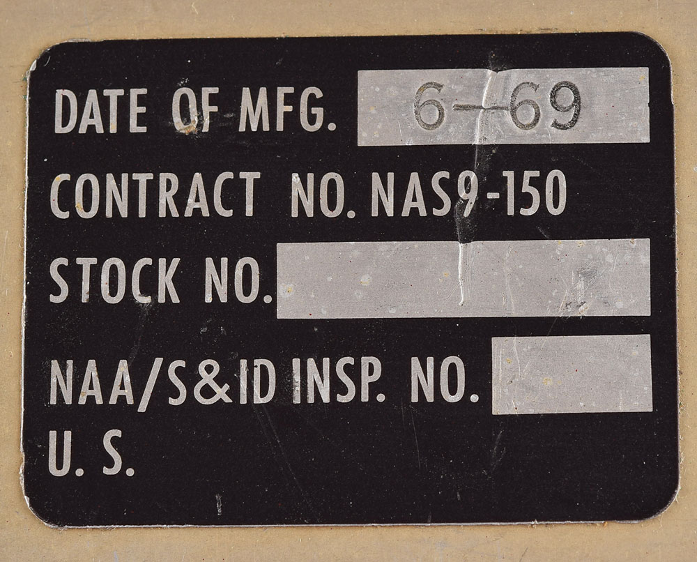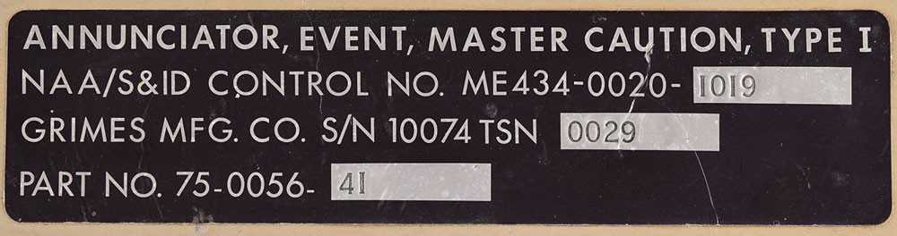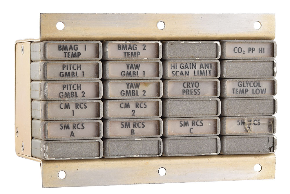 Apollo Command Module Block II annunciator caution panel, measuring 5″ x 3.5″ x 2.25″, with 24 indicators on the face, 16 of which are labeled. Indicators include "BMAG Temp," "Pitch Gmbl" "Yaw Gimbl," "CM RCS" "SM RCS," "Hi Gain Ant Scan Limit," "Cryo Press," "CO2 PP Hi," and "Glycol Temp Low." A Grimes parts label is affixed to the top, reading: “Annunciator, Event, Master Caution, Type I, NAA/S&ID Control No. ME434-0020-1019, Grimes Mfg. Co. S/N 10074 TSN 0029, Part No. 75-0056-41,” with a smaller label affixed to the bottom noting the date of manufacture as June 1969. The back features an electric input and bears an inspection stamp, certifying it as functional in July 1969. In fine condition. This panel comprised the left bank of the Caution and Warning System (C&WS) lights that were found on Panel 2 of the Command Module.