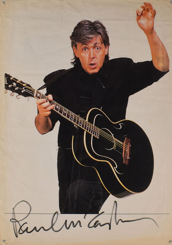 Color 11.5 x 16.5 poster showing McCartney playing a black acoustic guitar, prominently signed along the bottom in black felt tip. In very good condition, with edge toning, a few folds, and overall creasing. A fantastic poster boasting a huge signature of the rock icon from his post-Beatles solo career.