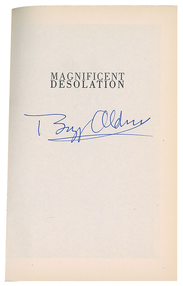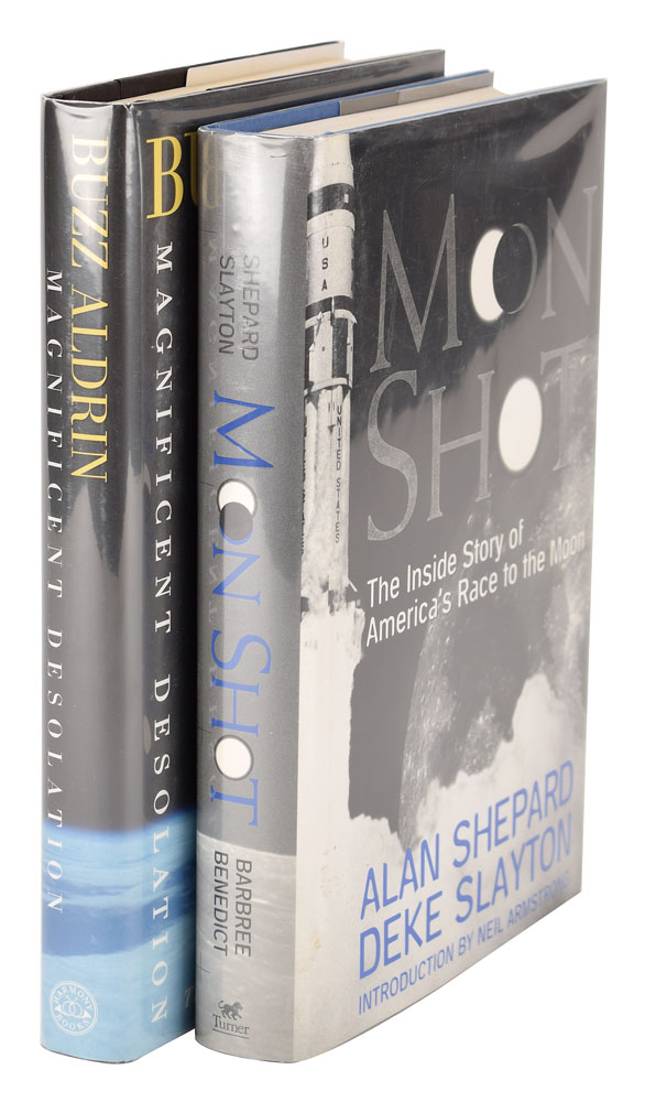 Two books: a first edition of Magnificent Desolation, hardcover with dust jacket, published by Harmony Books in 2009, signed on the half-title page in blue ink by Buzz Aldrin; and a first edition of Moon Shot, hardcover with dust jacket, published by Turner Publishing in 1994, signed on a bookplate affixed to the first free end page in black felt tip by Alan Shepard. In overall fine condition.
