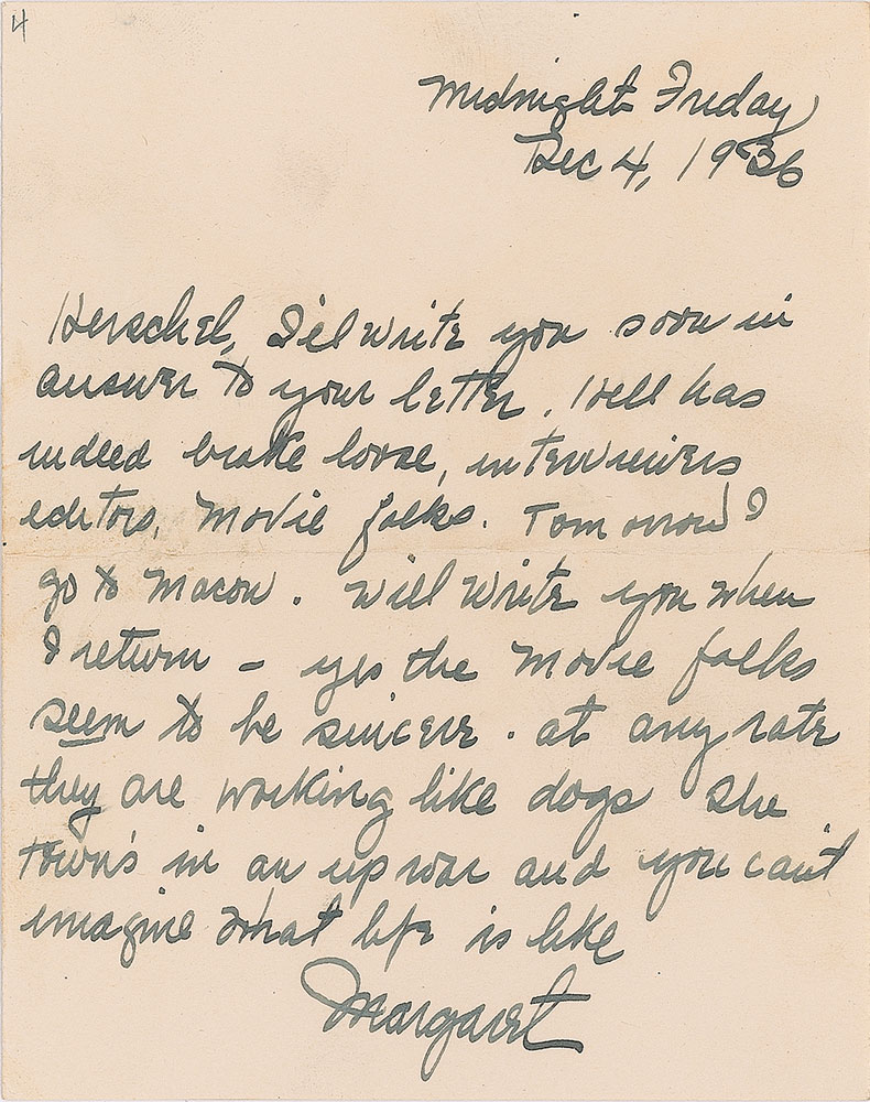 ALS signed “Margaret,” one page, 4 x 5.25, December 4, 1936. Letter to author and journalist Henry Herschel Brickell of the New York Post, in full: "I'll write you soon in answer to your letter. Hell has indeed broke loose, interviewers, editors, movie folks. Tomorrow I go to Macon. Will write you when I return—yes the movie folks seem to be sincere, at any rate they are working like dogs. The town's in an uproar and you can't imagine what life is like." In fine condition. Accompanied by the original mailing envelope, addressed in Mitchell's own hand. In July 1936—a month after Gone With the Wind was published—David O. Selznick bought the rights to the film adaptation for $50,000. Only the third handwritten letter from Mitchell we have offered, and our first in nearly four years, with this example by far the most desirable given its content relating to the early media whirlwind surrounding production of the Gone With the Wind movie.