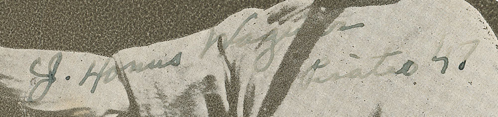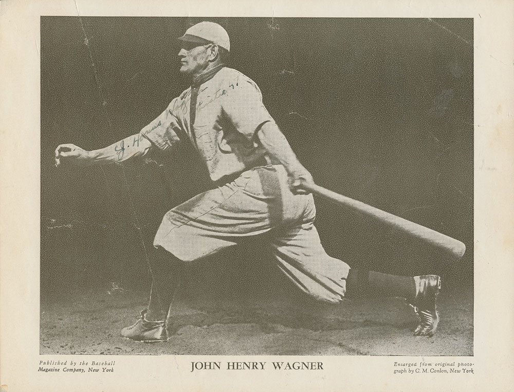 Vintage M114 Baseball Magazine premium of Wagner in a full-length post-swing pose, 9.75 x 8.25, signed along his arm and chest in fountain pen, "J. Honus Wagner, Pirates 47." Double-matted and framed with a descriptive caption to an overall size of 18 x 20.25. In very good condition, with scattered light creasing, a diagonal crease just touching the "J", and the ink just a shade light but fully legible. Pre-certified PSA/DNA and Beckett Authentication.