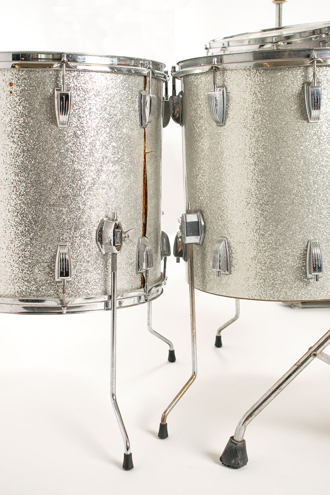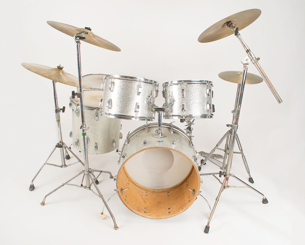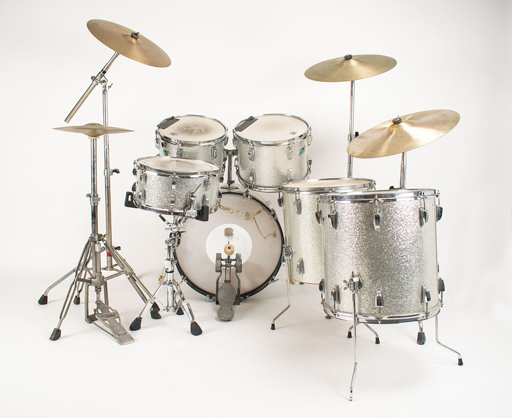 Sib Hashian's stage-used silver sparkle Ludwig drum kit played on his first two tours with Boston, featuring a bass drum with kick pedal, snare drum, high tom, mid tom, and two floor toms, plus high hat cymbals, two ride cymbals, and a crash cymbal, all with their stands. The blue-and-olive Ludwig badges have serial numbers that date the drums to 1969-1970. The drums are fitted with white Remo Weather King drumheads, all of which show heavy wear from use. Includes their road cases, all of which are stenciled "Boston" or feature the Boston logo.