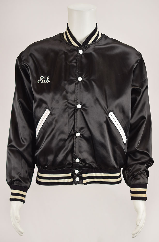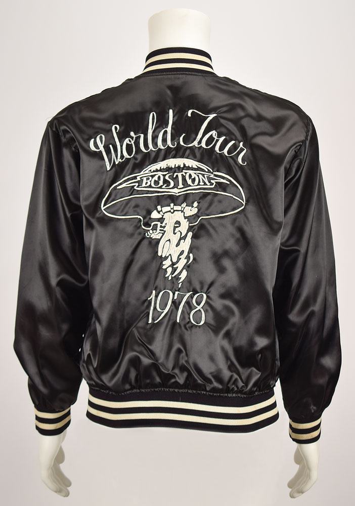 Sib Hashian's black varsity jacket for Boston's 1978 World Tour, size medium, 100% nylon, with a Felco tag to collar, the right chest embroidered in white thread, “Sib,” and the back featuring a large design of the Boston spaceship logo with lettering, “World Tour, 1978.” In fine condition, with expected wear from use. Provenance: From the Sib Hashian Collection, and accompanied by a letter of authenticity from the Hashian family. Proceeds to benefit The Sib Hashian Scholarship