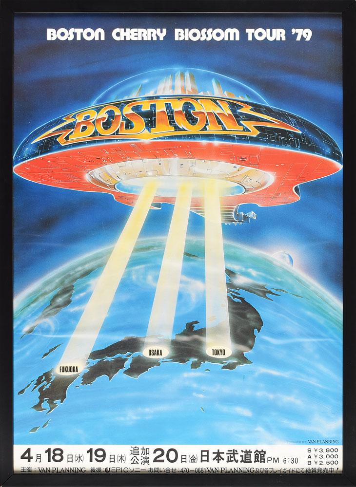 Sib Hashian's original color 20 x 28 poster for Boston's 1979 tour of Japan, showing a huge Boston spaceship casting rays of light down on their destinations in Fukuoka, Osaka, and Tokyo. White text at the top reads, "Boston Cherry Blossom Tour '79," with the dates of their shows at the bottom. Framed to an overall size of 22 x 30. In very good condition, with overall rippling. Provenance: From the Sib Hashian Collection, and accompanied by a letter of authenticity from the Hashian family. Proceeds to benefit The Sib Hashian Scholarship