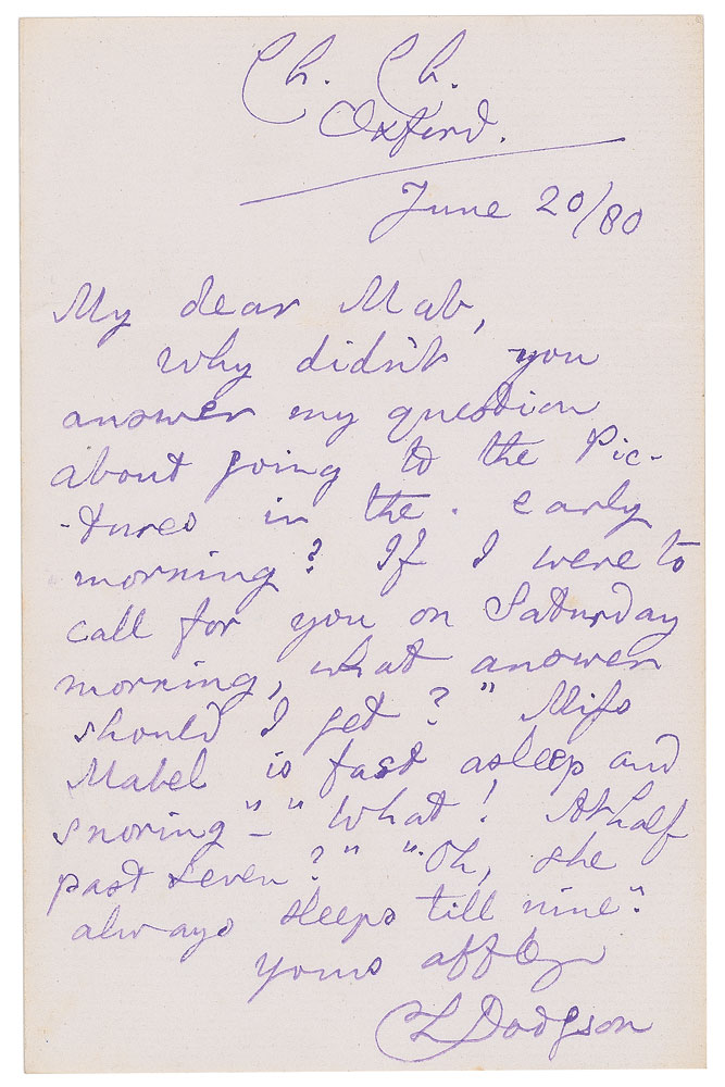 Beloved British author of Alice’s Adventures in Wonderland, better known by his pen name, Lewis Carroll (1832-1898). ALS signed “C. L. Dodgson,” one page, 4 x 6, June 20, 1880. Letter written to his young friend Mabel Burton, "My dear Mab," in full: "Why didn't you answer my question about going to the Pictures in the early morning? If I were to call for you on Saturday morning, what answer should I get? 'Miss Mabel is fast asleep and snowing'—'What! At half past seven?' 'Oh, she always sleeps till nine.'" In fine condition.