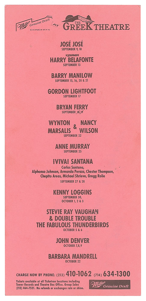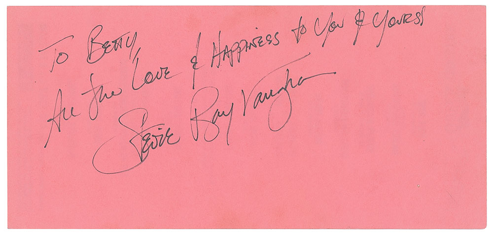Felt tip signature and inscription, "To Betty, All the Love & Happiness to you & yours, Stevie Ray Vaughan,” on the reverse of a pink 8.5 x 4 handbill for the Greek Theatre in Berkeley, California, which lists a pair of Stevie Ray Vaughan concerts on October 5 and 6, 1988. In very good to fine condition, with scattered light creasing and one small tack hole. Accompanied by a full letter of authenticity from JSA.