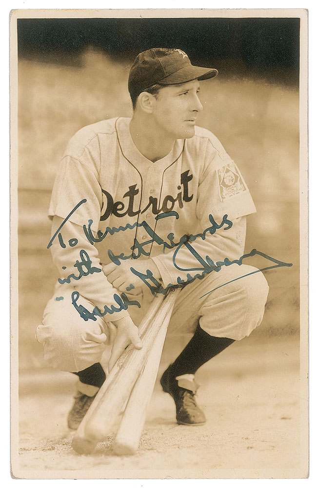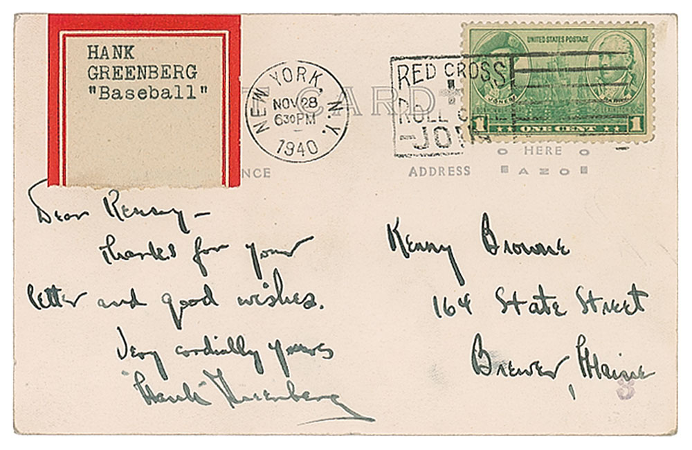Vintage matte-finish 3.5 x 5.5 postcard photo showing Greenberg crouching with three baseball bats, signed and inscribed in fountain pen, "To Kenny—with best regards, 'Hank' Greenberg," with a handwritten note on the reverse, "Dear Kenny—Thanks for your letter and good wishes, Very cordially yours, 'Hank' Greenberg." Postmarked at New York on November 28, 1940. In fine condition, with one small crease, a light paperclip impression, and a small label affixed to the reverse.