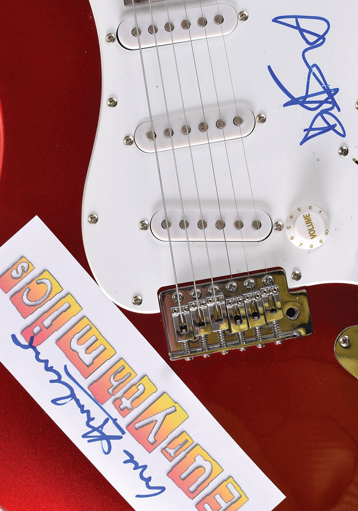 Red-bodied Stratocaster-style electric guitar with an affixed Eurythmics logo sticker, signed on the white pickguard in blue felt tip, "David A. Stewart," and on the sticker, "Love, Annie Lennox." In fine condition.