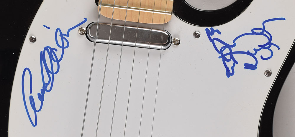 Black-bodied Telecaster-style electric guitar signed on the white pickguard in blue felt tip by Ann and Nancy Wilson, with the latter adding a heart with wings. In fine condition. From The John Brennan In-person Autograph Collection.