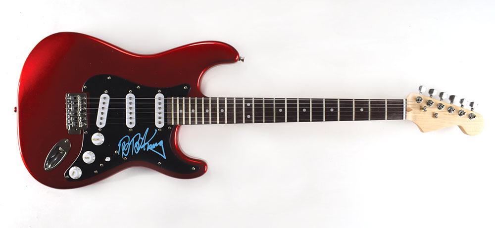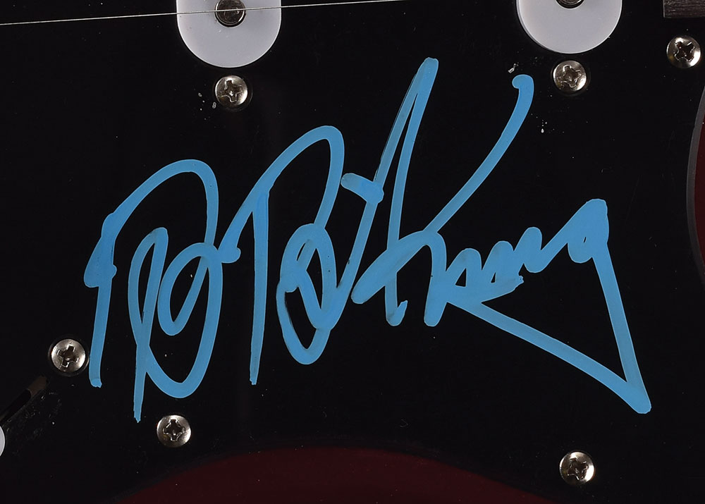 Attractive red-bodied Stratocaster-style electric guitar signed on the black pickguard in a bright blue paint pen by B. B. King. In fine condition, with trivial scuffing to pickguard. From The John Brennan In-person Autograph Collection.
