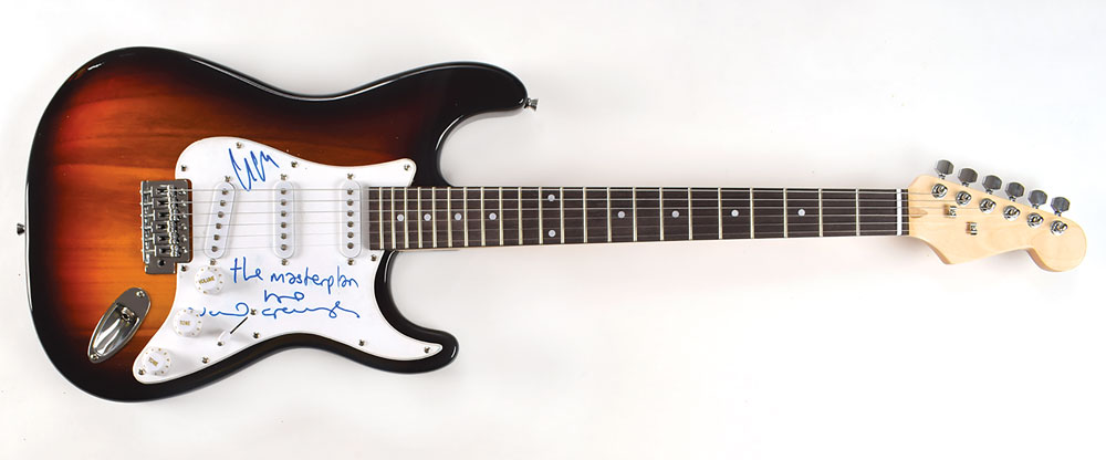Black-bodied Stratocaster-style electric guitar with a cool sunburst finish, signed on the white pickguard in blue felt tip, "Liam," and "The Masterplan, Love, Noel Gallagher." In fine condition, with light scattered soiling and smudging to pickguard, which is capable of being cleaned. From The John Brennan In-person Autograph Collection.