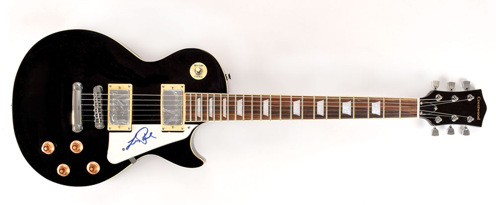 Handsome black-bodied Les Paul-style electric guitar by Crestwood, signed on the white pickguard in blue felt tip by Les Paul. In fine condition. From The John Brennan In-person Autograph Collection.
