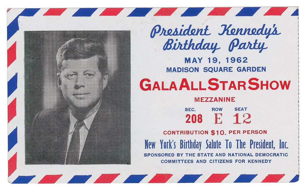 Unsigned original ticket stub for Kennedy's famous birthday celebration held at Madison Square Garden on May 19, 1962, 6.25 x 3.75, reading, "President Kennedy's Birthday Party?Gala All Star Show," and featuring an image of him on the left side. The ticket stub allowed entry to the mezzanine, section 208, row E, seat 12. The event has become infamous for Marilyn Monroe's sultry performance of the song, 'Happy Birthday, Mr. President.' In fine condition.