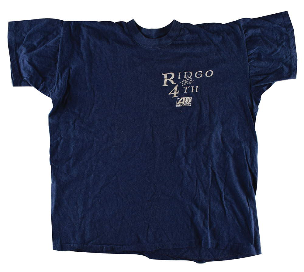 Ringo Starr's personally-owned and -worn navy blue Atlantic Records publicity t-shirt for the release of his 1977 album Ringo the 4th, no size but likely medium, with left chest featuring an Atlantic Records logo below white lettering: "Ringo the 4th." In fine condition. Accompanied by a letter of provenance from Nancy Lee Andrews, which reads: "I was engaged to Ringo from 1974 to 1980. We traveled the world and in that time I photographed two of his album covers and many publicity sessions. Ringo the 4th was one of the albums I shot. This was one of the promotional tee shirts. It was Ringo's personal shirt. I don't know how but I found it in my possession after we broke up."