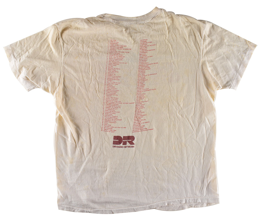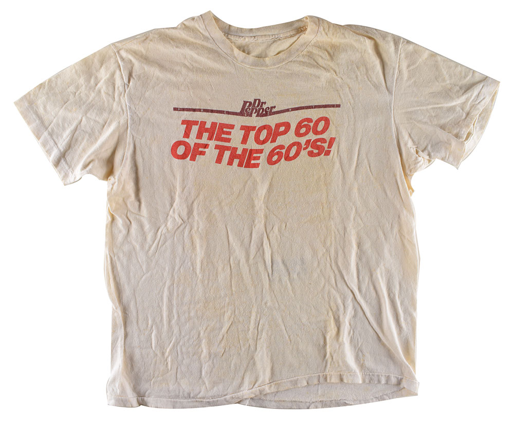 Ringo Starr's personally-owned and -worn cream-colored Dr. Pepper t-shirt, no size but likely medium/large, with front reading in maroon and red: "Dr. Pepper Presents The Top 60 of the 60's!" The back of the shirt shows a DIR Radio Network logo below a list of the top 60 songs of the 1960s, which includes six songs by the Beatles: 'Hey Jude,' 'I Want to Hold Your Hand,' 'Yesterday,' 'Sgt. Pepper/A Day in the Life,' 'Twist and Shout,' and 'All You Need Is Love.' In very good to fine condition, with some light staining. Accompanied by a notarized all-purpose acknowledgment and a letter of provenance from Nancy Lee Andrews, which reads: "I?was engaged to Ringo Starr from 1975-80. I discovered this promotional only tee shirt in my long-term storage. It was Ringo's shirt and he slept in it as well as wore it around the house and pool."