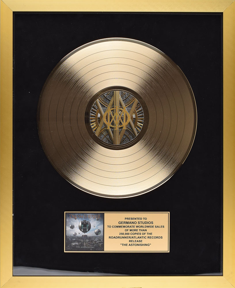 In-house sales award presented “to Germano Studios to commemorate worldwide sales of more than 250,000 copies of the Roadrunner/Atlantic Records release 'The Astonishing.'” Framed with its plate, a small image of the album cover, and disc to an overall size of 17.25 x 21.25. Award retains its original backing with a Germano Studios of New York label. In fine condition.