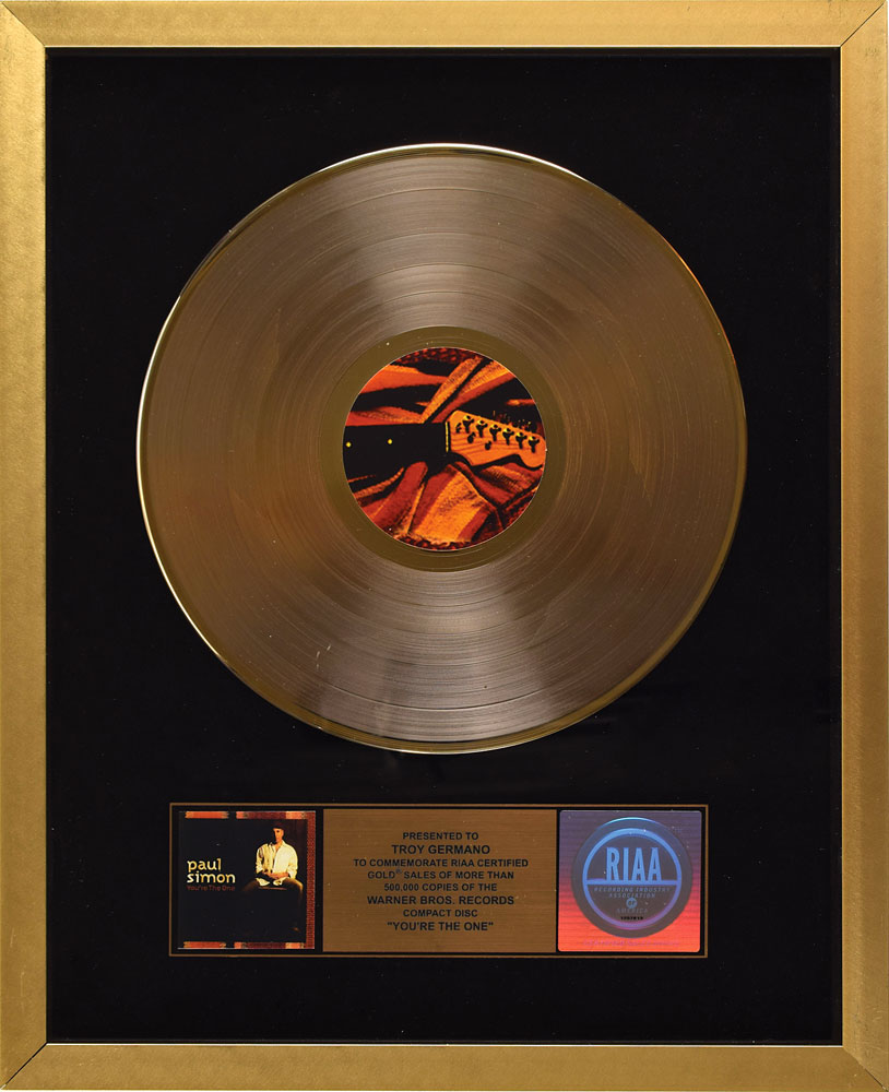 Official serial number hologram-style RIAA gold sales award presented “to Troy Germano to commemorate RIAA certified gold sales of more than 500,000 copies of the Warner Bros. Records compact disc 'You're the One.'” Framed with its plate, a small image of the album cover, and disc to an overall size of 17.25 x 21.25. Award retains its original backing with Ill-Eagle Enterprises and Germano Studios of New York labels. In fine condition.