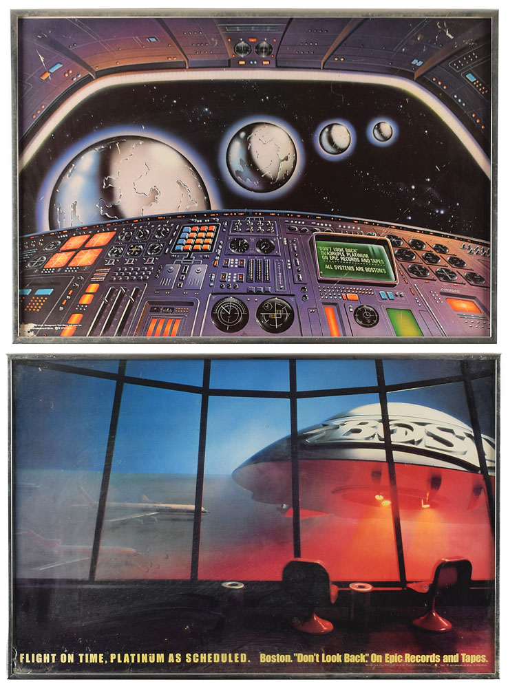 Pair of Sib Hashian's platinum status promo posters for Boston's 1978 album Don't Look Back: one with a Boston spaceship landing at an airport, featuring the text: "Flight on time, platinum as scheduled. Boston. 'Don't Look Back.' On Epic Records and Tapes"; and the other featuring an illustrated spaceship cockpit, with the text, " 'Don't Look Back. Quadruple Platinum. On Epic Records and Tapes. All systems are Boston's." Individually framed to 22 x 15. In overall fine condition, with scuffing to the lower left corner of the second poster. Provenance: From the Sib Hashian Collection, and accompanied by a letter of authenticity from the Hashian family. Proceeds to benefit The Sib Hashian Scholarship