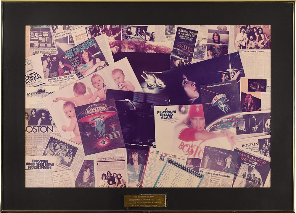 Sib Hashian's oversized display presented by Epic Records to commemorate Boston's success in 1977, featuring a huge color image of reviews, news clippings, and promo materials produced throughout the year, matted and framed to an overall size of 36 x 26. An engraved plaque affixed to the front reads: "From the entire Epic family, super thanks to you for a great year! You've made 1977 unforgettable and we know 1978 will be even more of a year to remember." In fine condition, with the engraved plaque slightly bent. Provenance: From the Sib Hashian Collection, and accompanied by a letter of authenticity from the Hashian family. Proceeds to benefit The Sib Hashian Scholarship