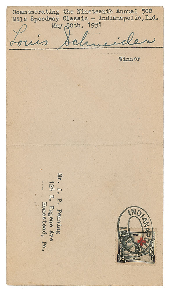 Automobile racer (1901-1942) who won the 1931 Indianapolis 500, and died in 1942 following complications from injuries suffered in a 1938 midget race. Vintage fountain pen signature, "Louis Schneider,” on a 6.5 x 3.5 cover postmarked at Indianapolis, Indiana, with a typed caption reading: "Commemorating the Nineteenth Annual 500 Mile Speedway Classic - Indianapolis, Ind., May 30th, 1931." In fine condition, with a central vertical fold.