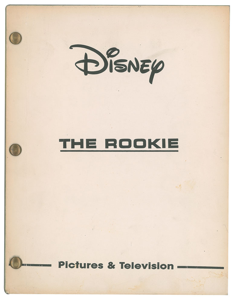 Original brad-bound 'rainbow' production screenplay for the 2002 Buena Vista Pictures sports drama The Rookie, approximately 135 pages, 8.5 x 11, housed in its original white-board Disney studio wrapper. In fine condition, with handling wear from use.