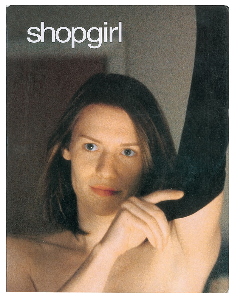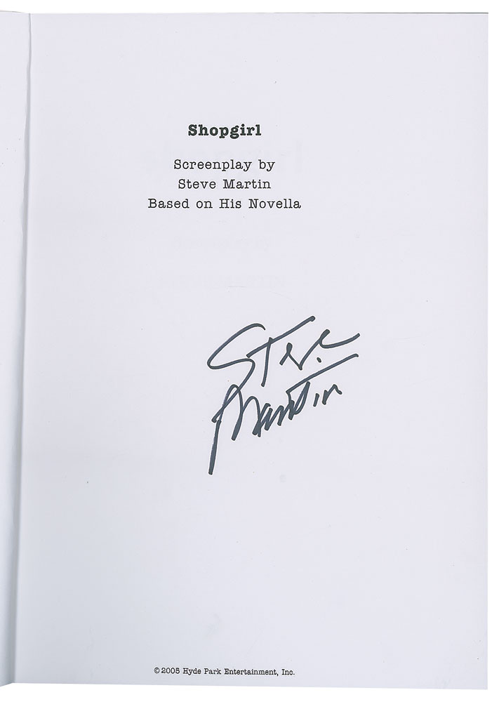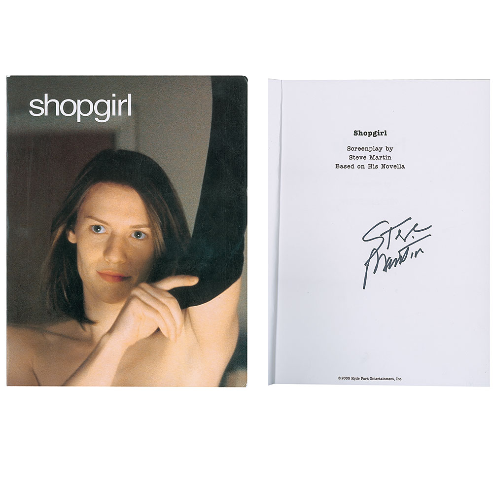 Very appealing brad-bound 'for your consideration' screenplay for the 2005 Buena Vista romantic comedy-drama Shopgirl, with color wrapper showing lead actress Claire Danes as Mirabelle Buttersfield, 122 pages, 8.5 x 11, signed on the title page in black felt tip by comedian, producer, and screenwriter Steve Martin. In fine condition.