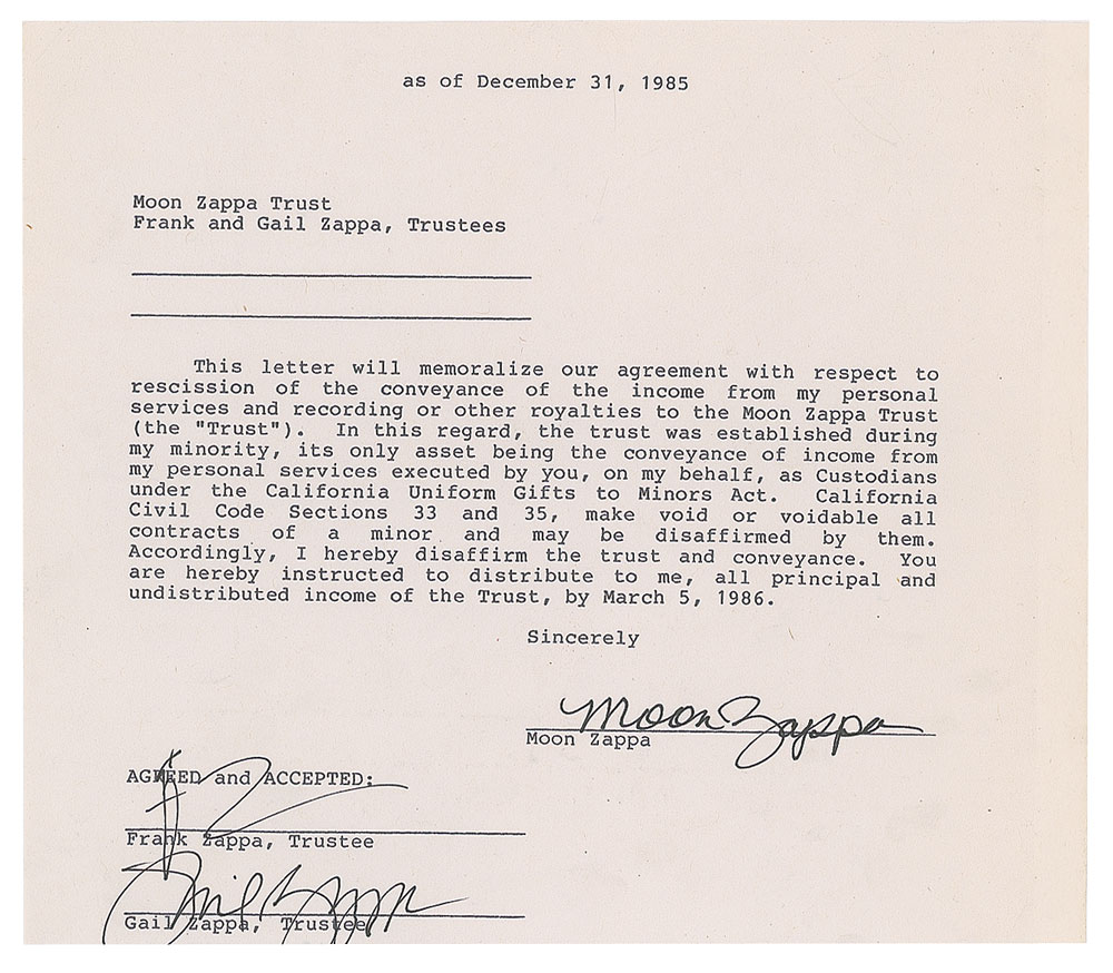 DS, signed “FZ," "Moon Zappa," and "Gail Zappa,” one page, 8.5 x 7.25, December 31, 1985. Agreement regarding the "rescission of the conveyance of the income" from Moon Zappa's "personal services and recording or other royalties to the Moon Zappa Trust," with "all principal and undistributed income of the Trust" to be distributed to Moon directly by March 5, 1986. Signed at the conclusion in black ink by Frank, Moon, and Gail Zappa. In fine condition, with trimming to the bottom edge nipping off the bottom of Gail's signature. Accompanied by a glossy 9.5 x 7.5 photo of the family, which is framed to a slightly larger size.