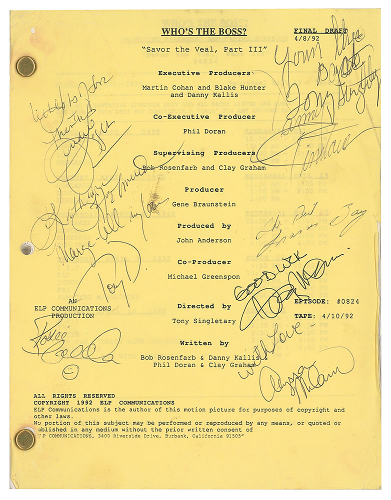 Original brad-bound final draft script belonging to a crew member for the Who's the Boss? episode 'Savor the Veal: Part III,' 54 pages, 8.5 x 11, dated April 8, 1992, signed on the front cover in black ballpoint by several cast members, including: Tony Danza, Judith Light, Alyssa Milano, Danny Pintauro, Katherine Helmond, and others. In very good to fine condition, with expected wear from use, with some small scattered tears and stains.