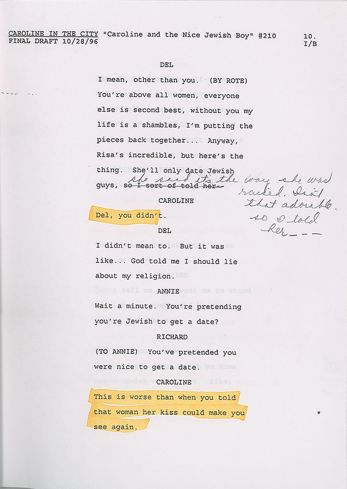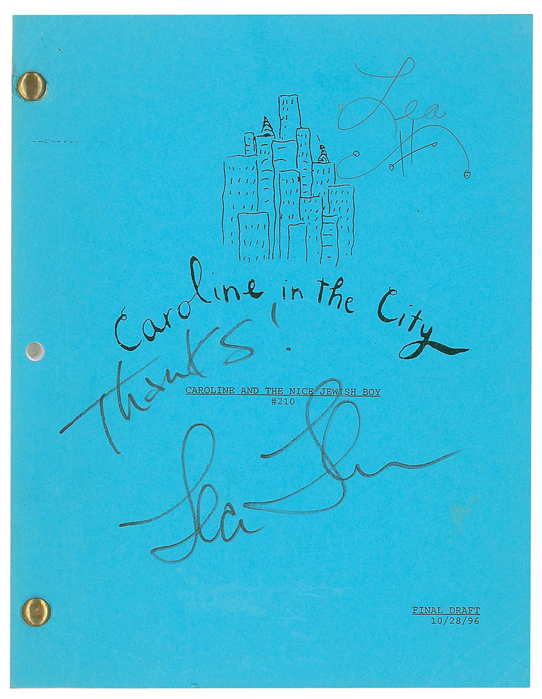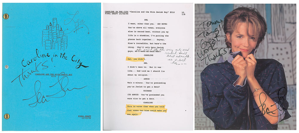 Brad-bound final draft script belonging to actress Lea Thompson for the Caroline in the City episode 'Caroline and the Nice Jewish Boy,' season two, episode six, 50 pages, 8.5 x 11, dated October 28, 1996, signed on the front cover in pencil, "Thanks! Lea Thompson," with upper corner bearing an ownership notation. Thompson has added highlights and ballpoint annotations to several pages of the script. Includes a color glossy 8 x 10 half-length photo of Thompson as the title character, signed and inscribed in black felt tip, "Tommy Tang! Great work, thanks, Leah Thompson." In overall fine condition, with expected wear from use.