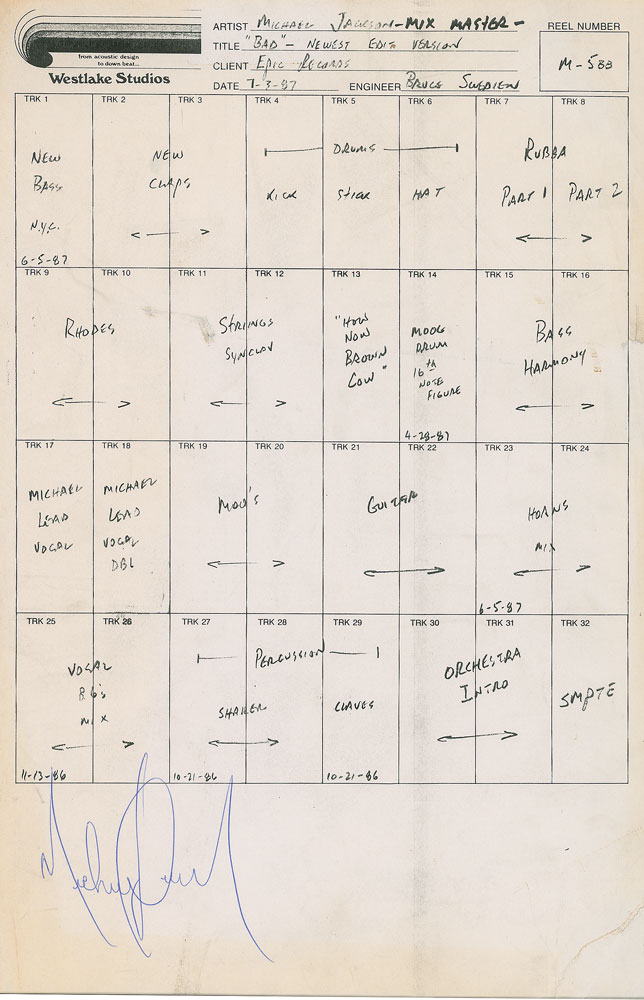 Uncommon 11 x 17 copy of a Westlake Studios mixing/mastering sheet for the production of Michael Jackson's seventh studio album Bad, signed in the lower border in blue ballpoint by Jackson. The sheet, identified as "Reel Number M-5BB," consists of 32 tracking spots with upper portion reading: "Artist: Michael Jackson—Mix Master—, Title: Bad—Newest Edit Version, Client: Epic Records, Date: 7-3-87, Engineer: Bruce Swedien." Rolled and in very good to fine condition, with some creasing and soiling, and a repaired tear to the lower right corner.